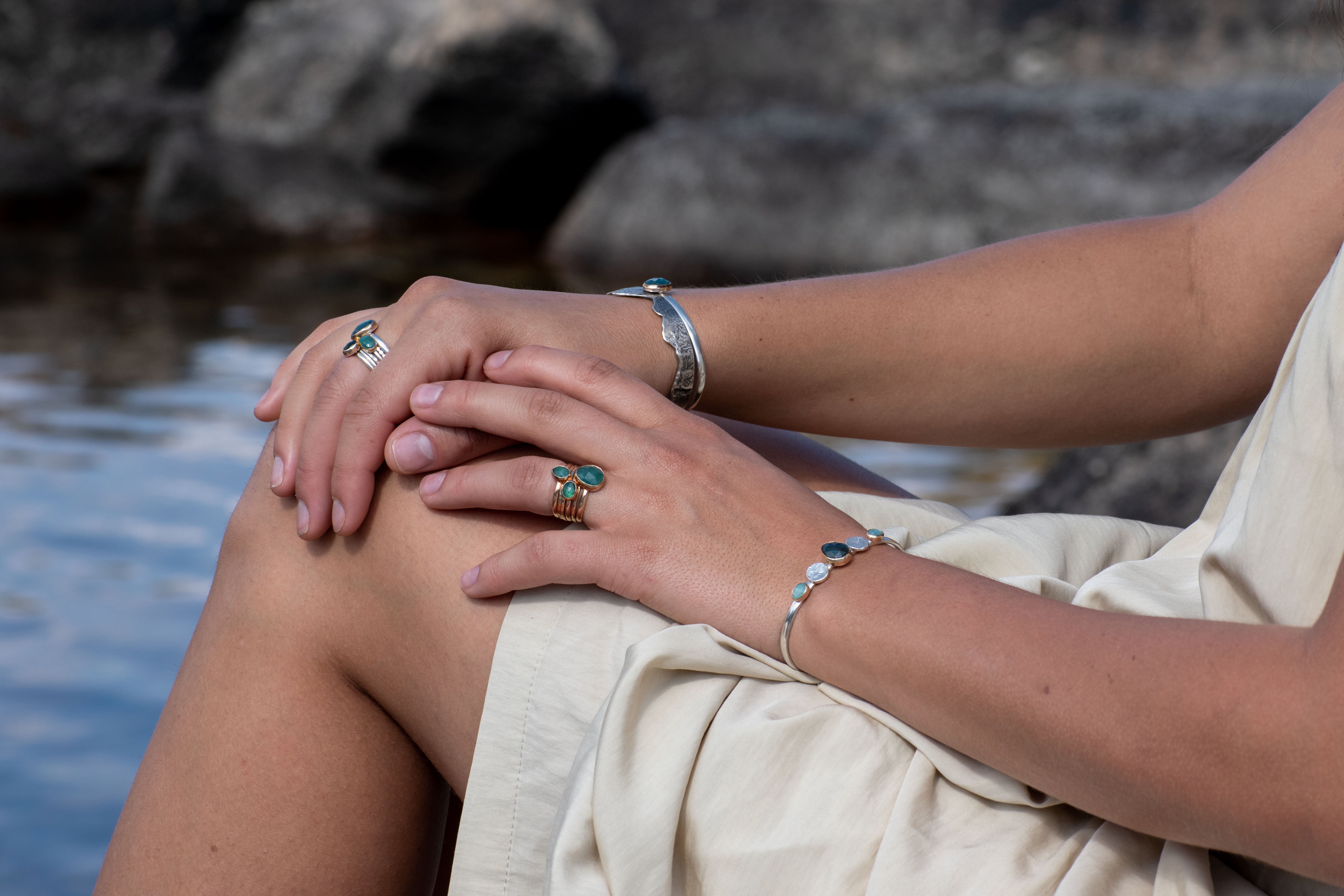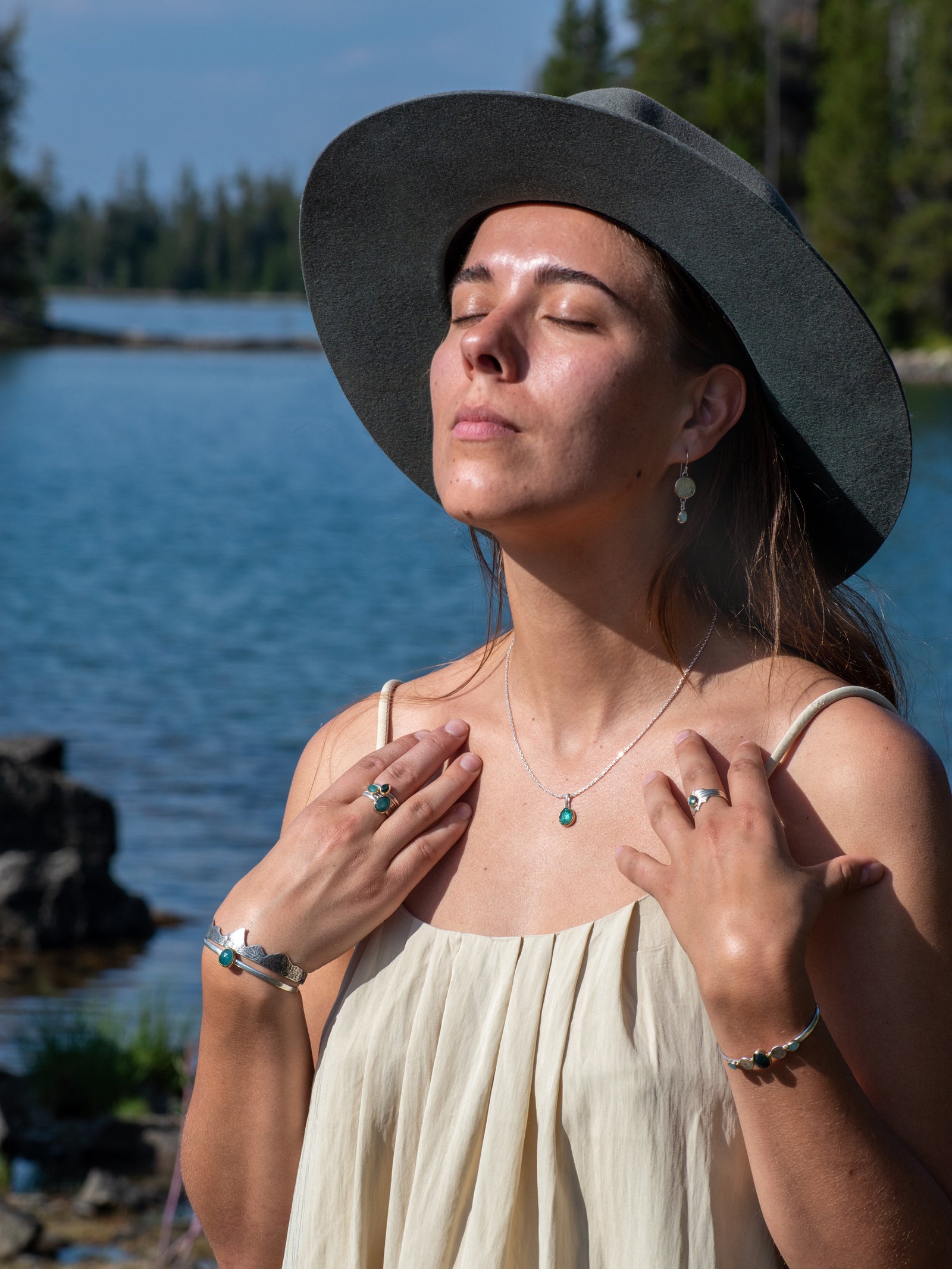 At the heart of this collection lies grandidierite, a rare mineral chosen for its stunning teal hues reminiscent of the pristine glacial and alpine waters that grace the Tetons. Just as nature revels in boundless diversity, each stone possesses its own unique characteristics with a vast range of color and opacity. As you gaze upon and adorn yourself with these pieces, may you feel the calming and renewing essence of these colors, drawing you closer to the serene energy of these natural wonders.