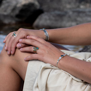 You have the option to select a light blue, medium or dark teal stone. Refer to the grandidierite color reference image to choose a shade. Please keep in mind that grandidierite exhibits vast variations in color and opacity, making each ring truly unique.